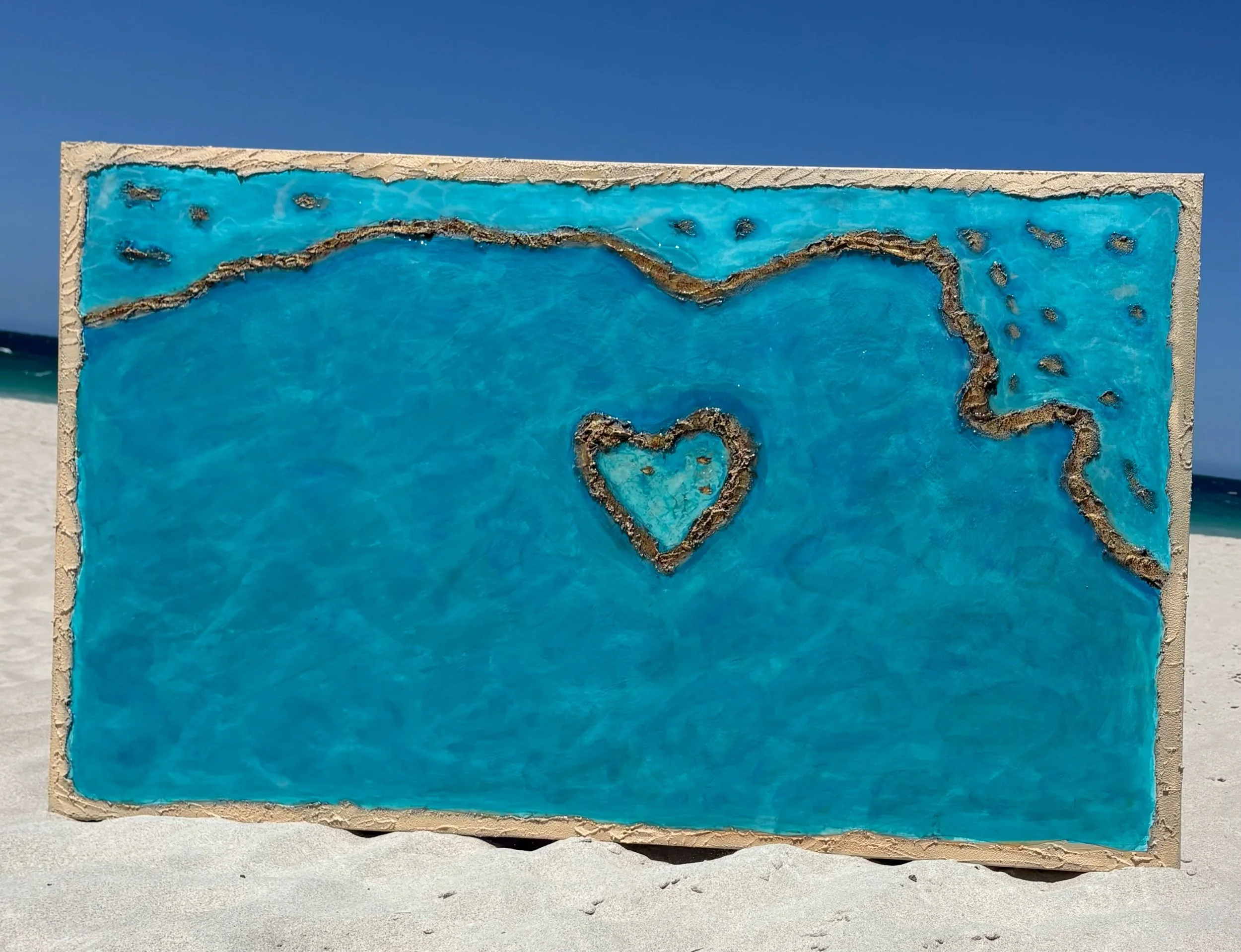 Heart of the Whitsundays is an original, one-of-a-kind artwork inspired by the iconic aerial beauty of Australia’s Whitsunday Islands. Created using a rich mix of acrylic paints, oil pastels, and finished with excusite textures and a glossy resin layer, this piece captures the flowing movement and luminous tones of tropical waters.